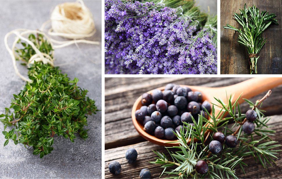 Prunus amygdalus dulcis (sweet almond) oil, Vitis vinifera (grape) seed oil, Rosmarinus officinalis (rosemary) leaf oil, Juniperus communis fruit oil, Triticum vulgare (wheat) germ oil, Lavandula angustifolia (lavender) oil, Thymus vulgaris (thyme) flower/leaf oil, Zingiber officinale (ginger) root oil, Origanum vulgare oil, Tocopherol