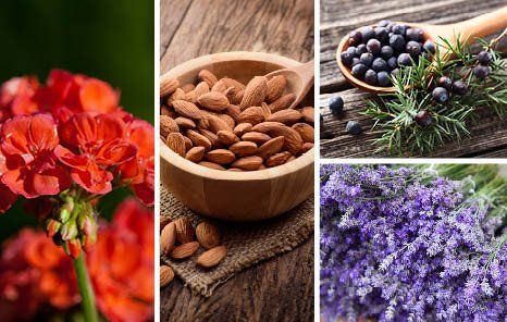 Vitis vinifera (grape) seed oil, Prunus amygdalus dulcis (sweet almond) oil, Triticum vulgare (wheat) germ oil, Citrus limon (lemon) peel oil, Cupressus sempervirens leaf/nut/stem oil, Lavandula angustifolia (lavender) oil, Pelargonium graveolens flower oil, Juniperus communis fruit oil, Pogostemon cablin oil, Tocopherol